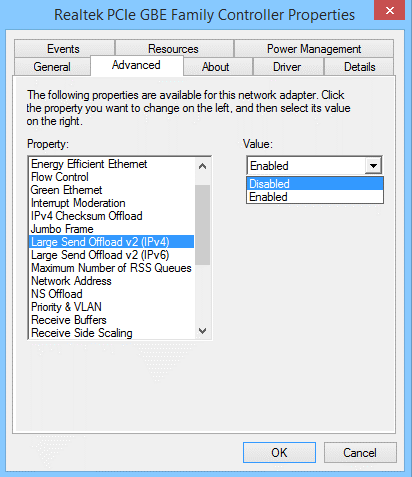 Step 3- Double-click Network Card > select the Advanced > Large Send Offload V2 (IPv4).