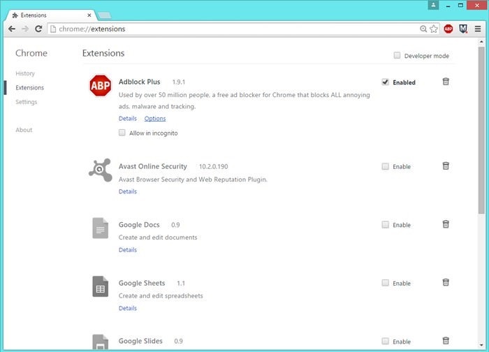 Step 2- Un-tick the extensions that you want to disable or either to delete the extension click on the Trash option.