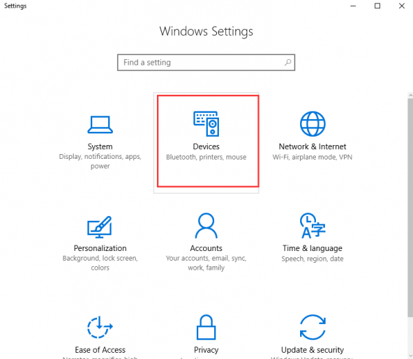 Step 2: Now click on Devices option. And locate Mouse and Touchpad option on the left hand side. Choose it.