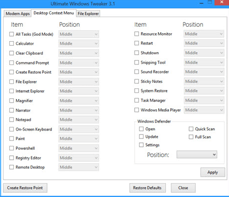 Customization: Using this tweak you can change settings of your Taskbar, Thumbnails, File Explorer and the Modern UI.