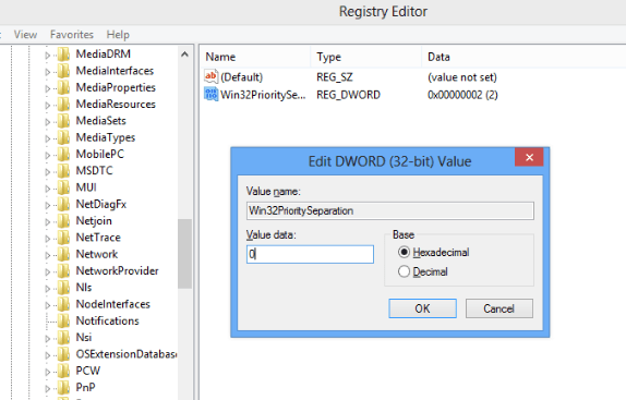 - Now click Win32PrioritySeparation and then select Modify to open the Edit DWORD (32-bit) Value box.