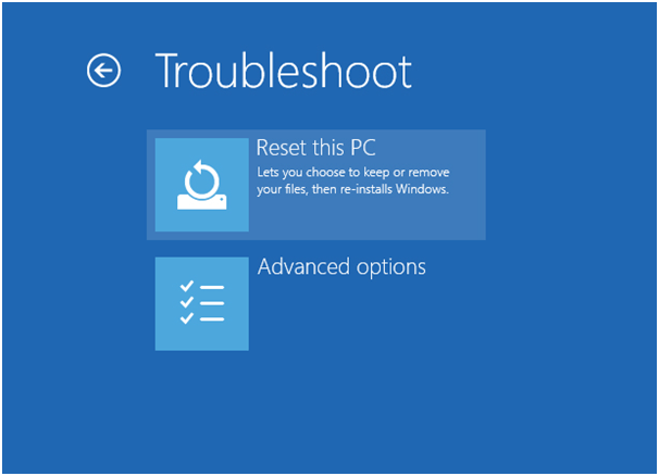 After clicking on Troubleshoot, select the option, RESET THIS PC.