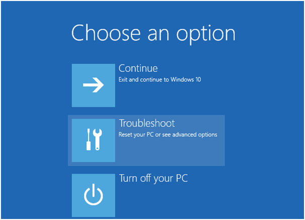 When CHOOSE AN OPTION screen appears, click on Troubleshoot.
