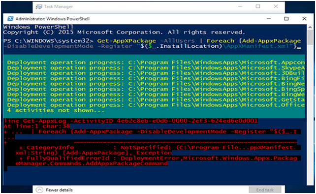 Get-AppXPackage -AllUsers | For each {Add-AppxPackage -DisableDevelopmentMode -Register “$($_.InstallLocation)\AppXManifest.xml”}