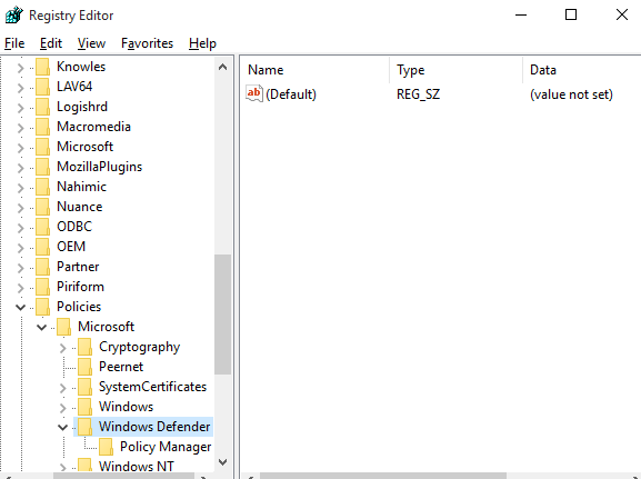 Step 4: Inside Policies folder, find Microsoft subfolder > open it > Find Windows Defender folder > Open it.