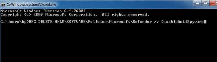Step 2: Type REG DELETE “HKLM\SOFTWARE\Policies\Microsoft\Defender” /v DisableAntiSpyware.