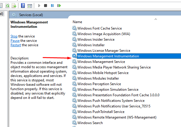 - Users can then locate the WMI service from the service console. A simple way to do this is by just selecting a service and then pressing W to identify all the services that start with the letter ‘W.’