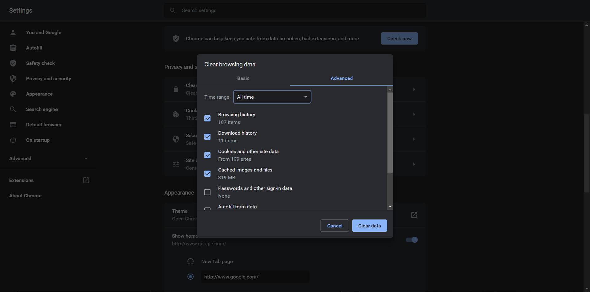 - Tick the options which you want to delete from your browser. Switch to the Advanced tab for a more detailed menu.