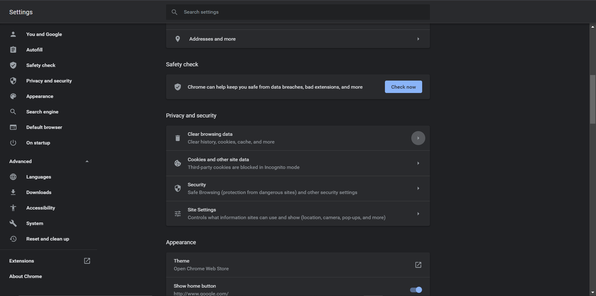 - Click on the ‘Cookies and other site data’ option by scrolling down.